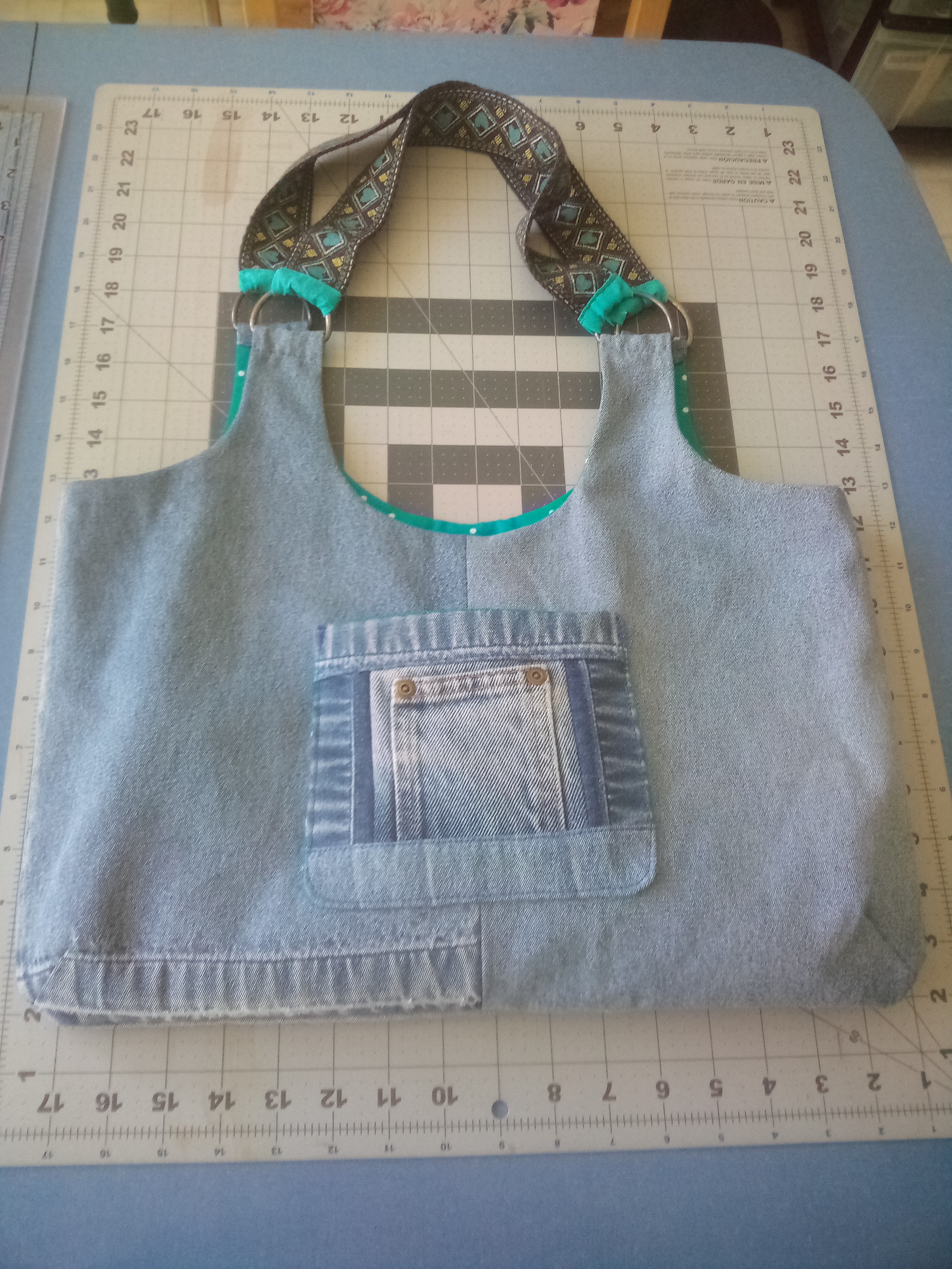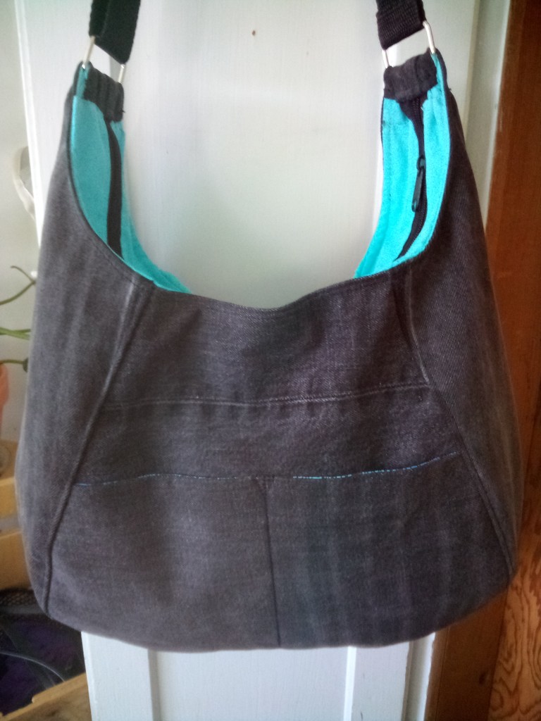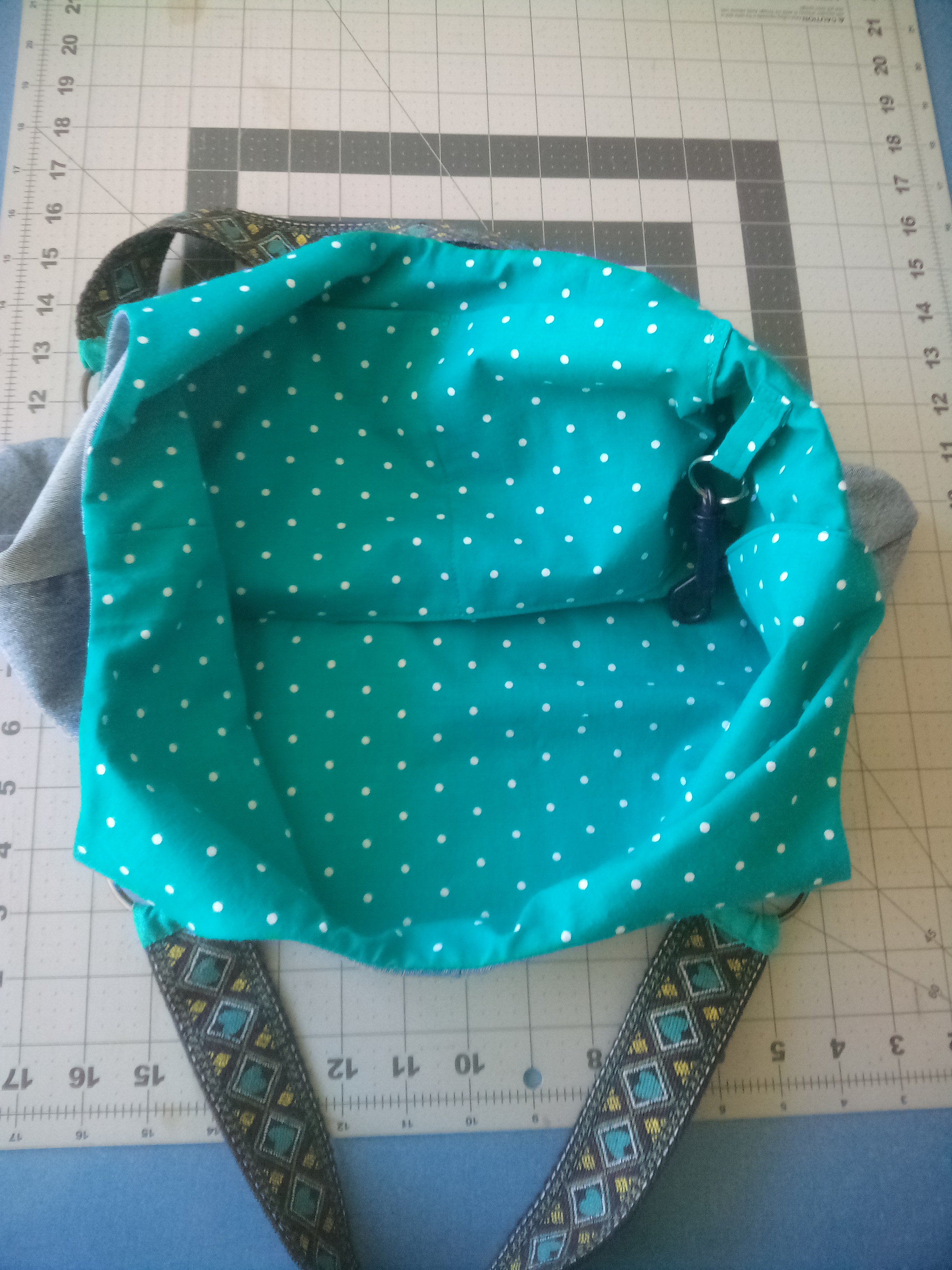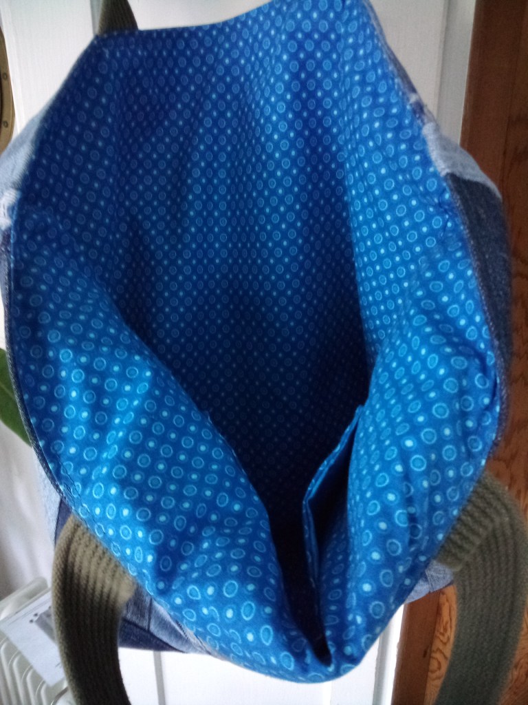 I used a printed cotton for the lining, and “D” rings on the straps. There is a large pocket on the lining, and a decorative, but practical one on the outside.