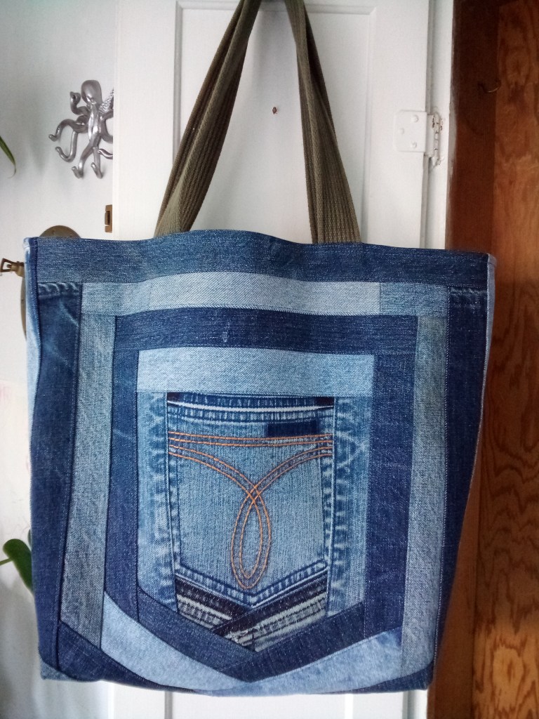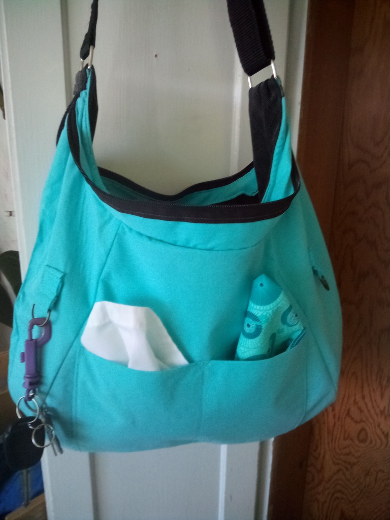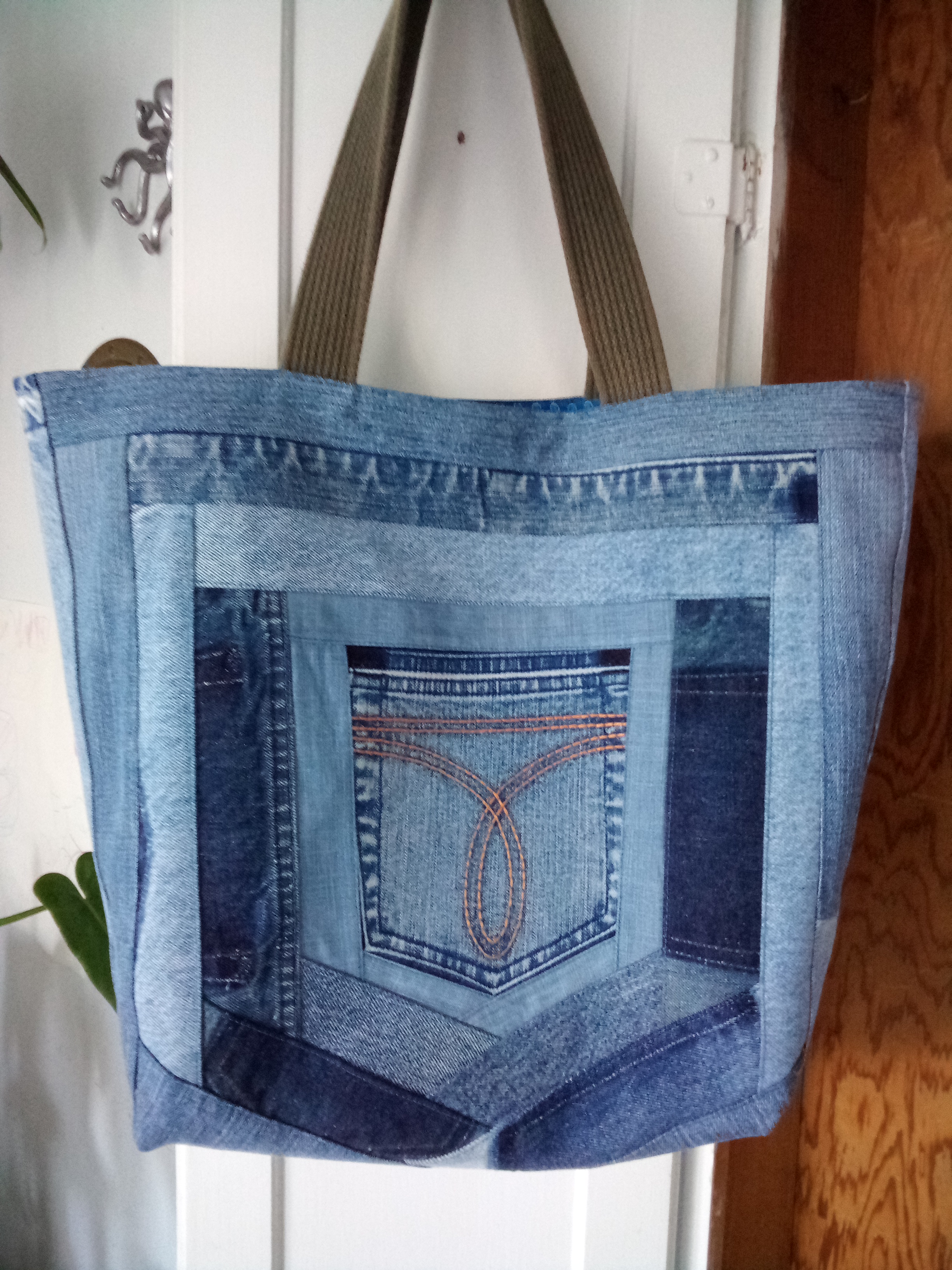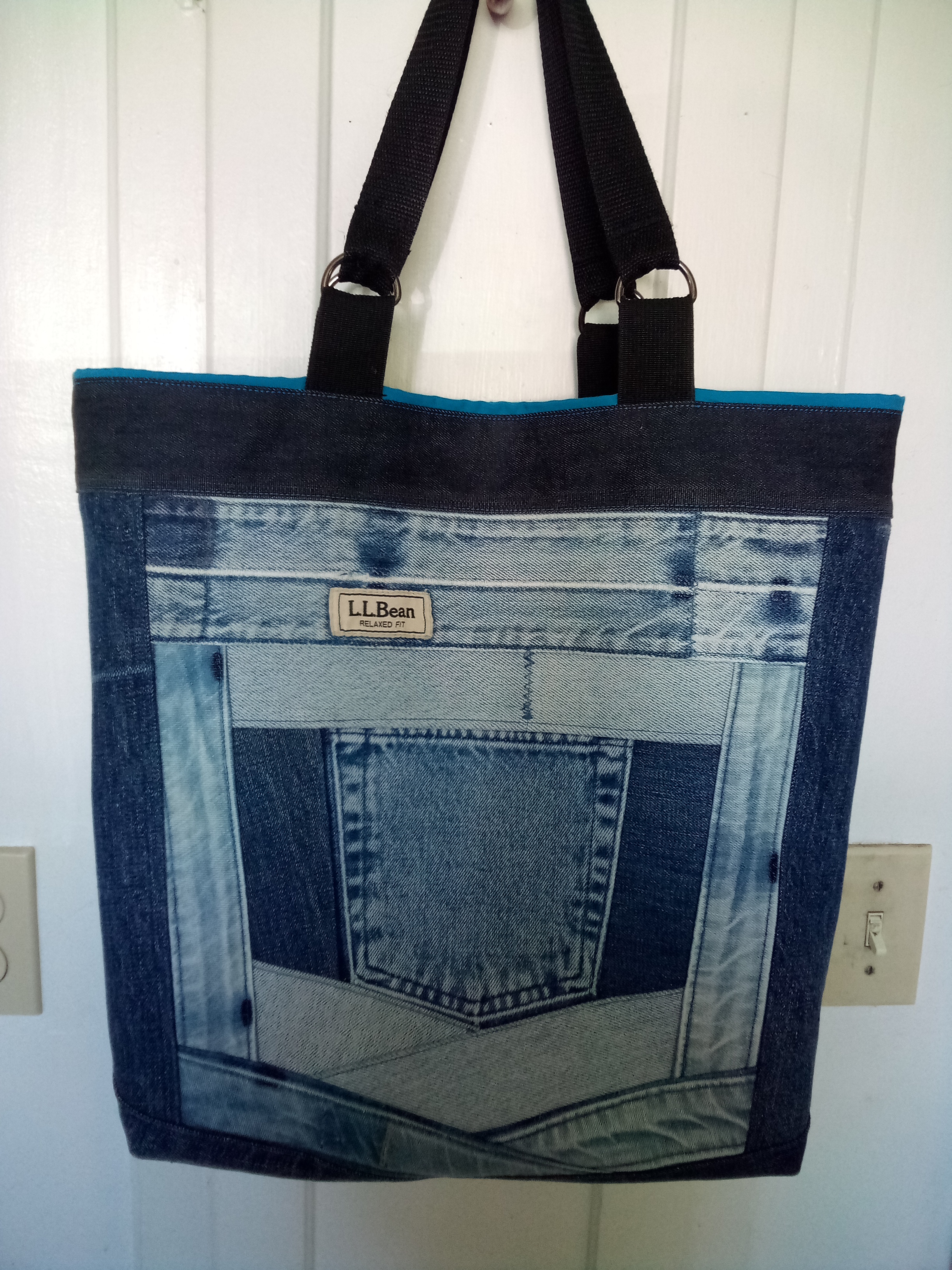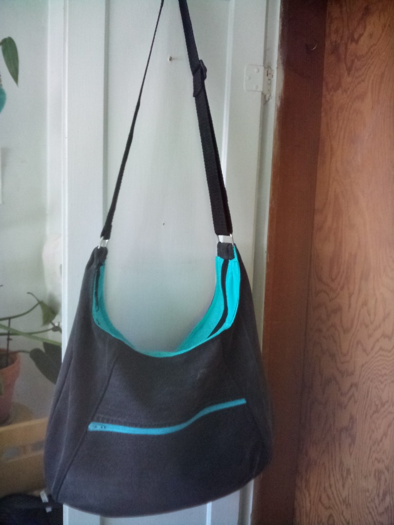 I used a printed cotton for the lining, and “D” rings on the straps. There is a large pocket on the lining, and a decorative, but practical one on the outside.