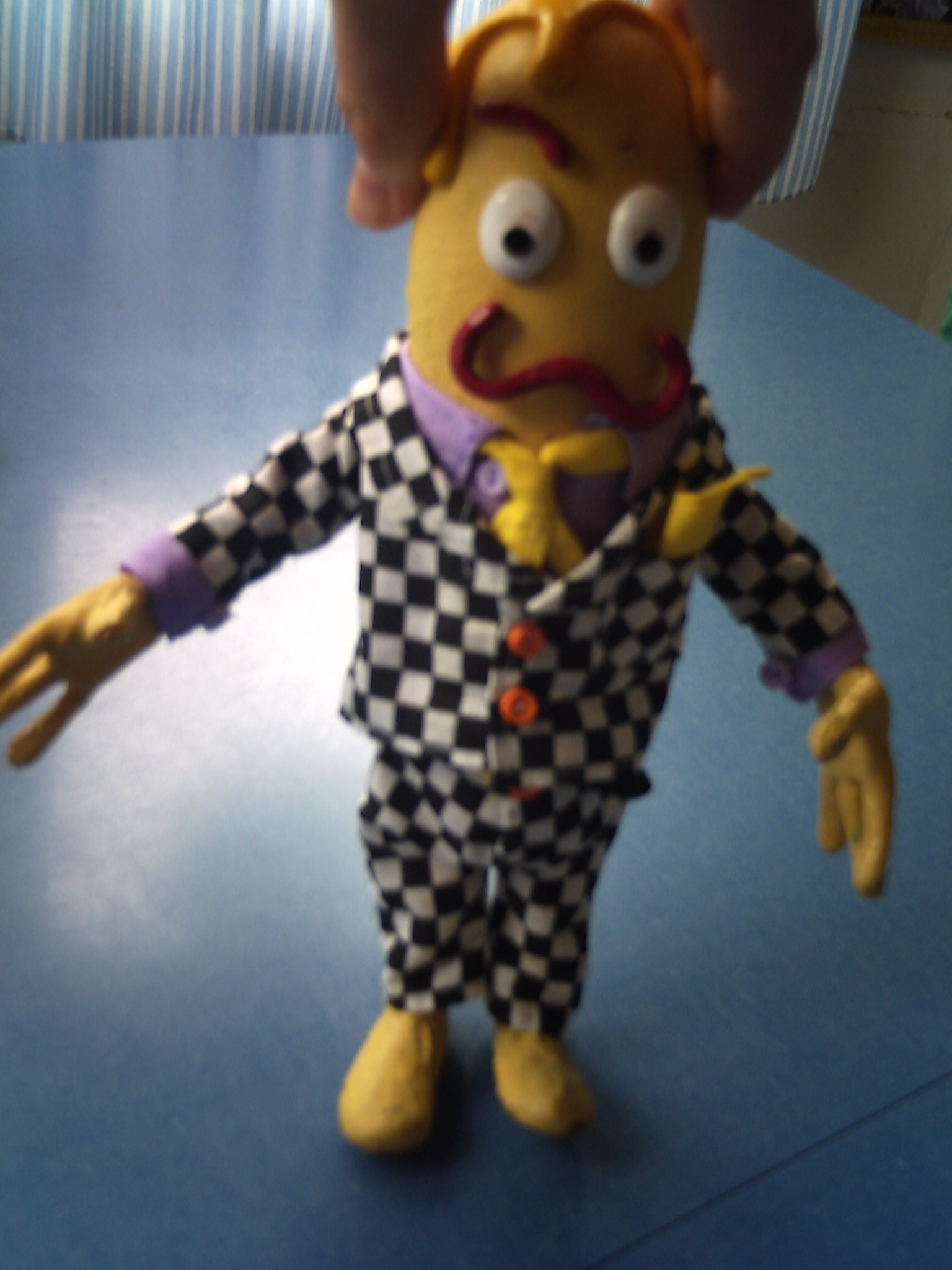 I met with the guys again today. I delivered Ginger, and Pickle. They really liked what I had done, and sent me home with Corndog. He needs his jacket altered, and a new pair of slacks. Also, his checkered suit needs to be top stitched in white thread. I was also asked to make a pair of boxer shorts for Mr. Pickle. I agreed, and headed home to get started.