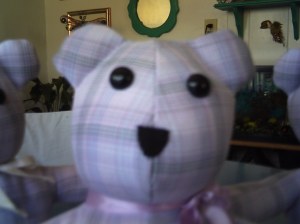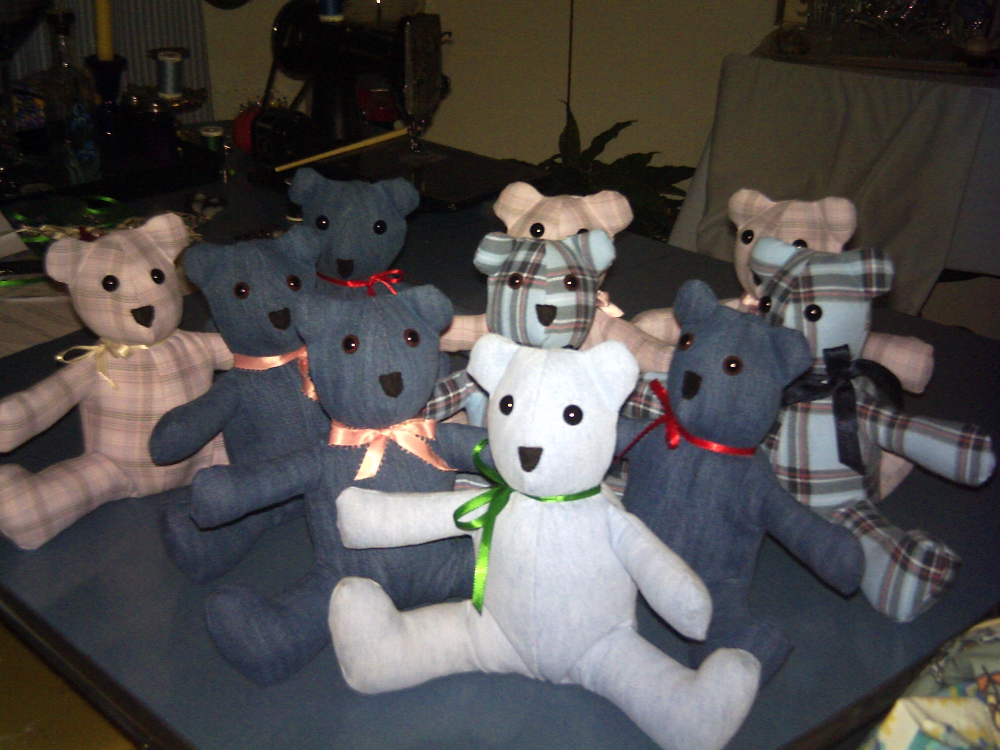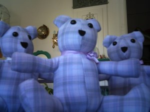 Since I was not working, I wanted to put my sewing skills to use in a way other then my gigs from Craigslist. My nephew told me about an organization that had volunteers make teddy bears for families, who had a member recently pass. They are made from articles of clothing of the deceased. I thought, what a wonderful idea. I need to do that. I contacted the lady who was in charge of that department, and soon was on my way to being a member of the volunteer sewing group. Here are a few pictures of the first group of bears.