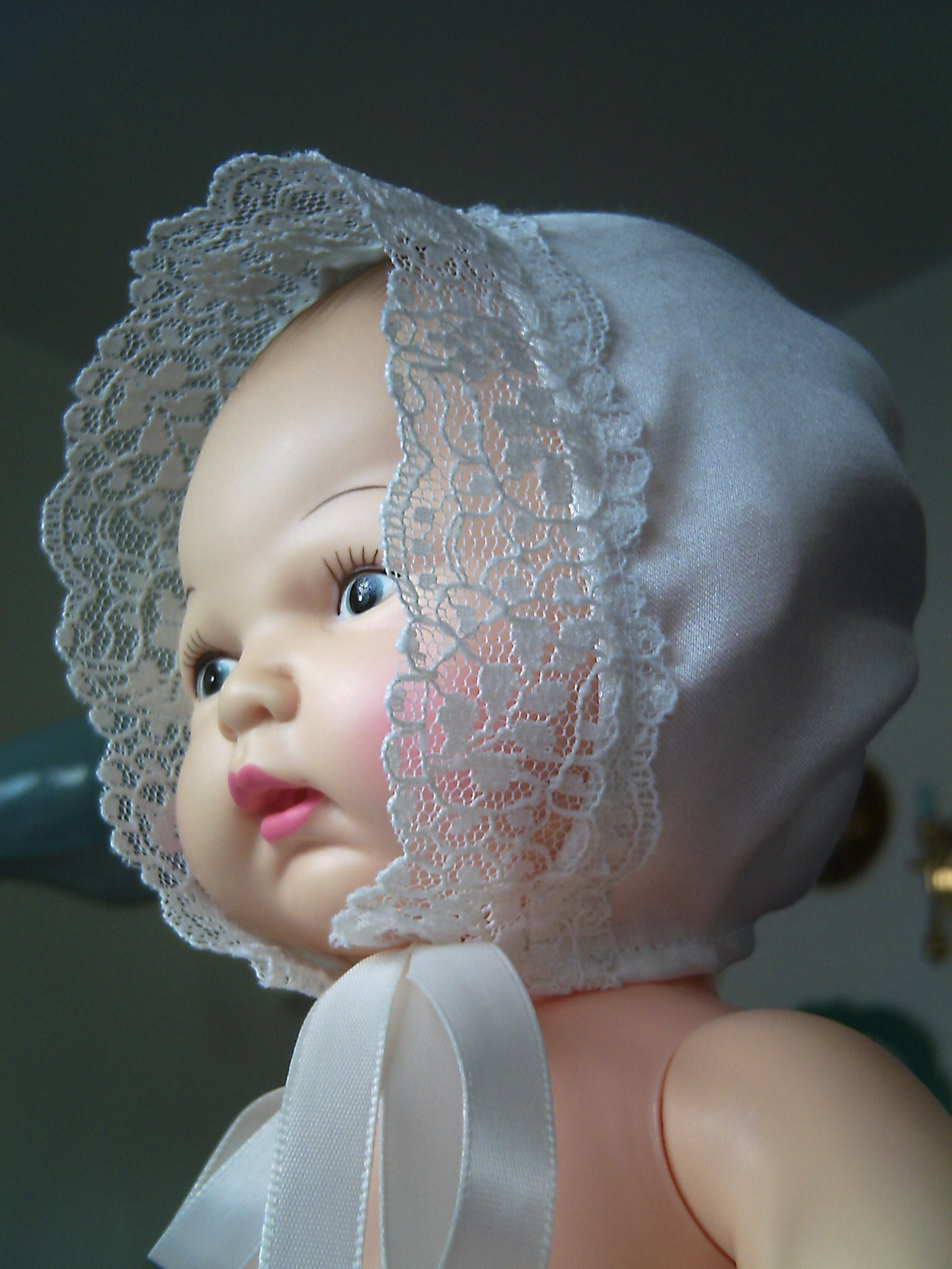 Started sewing on the christening set this morning. Started with the bonnet. It turned out really nice. I am jazzed!!!! I hope my customer likes it. Took a few pics. Check it!