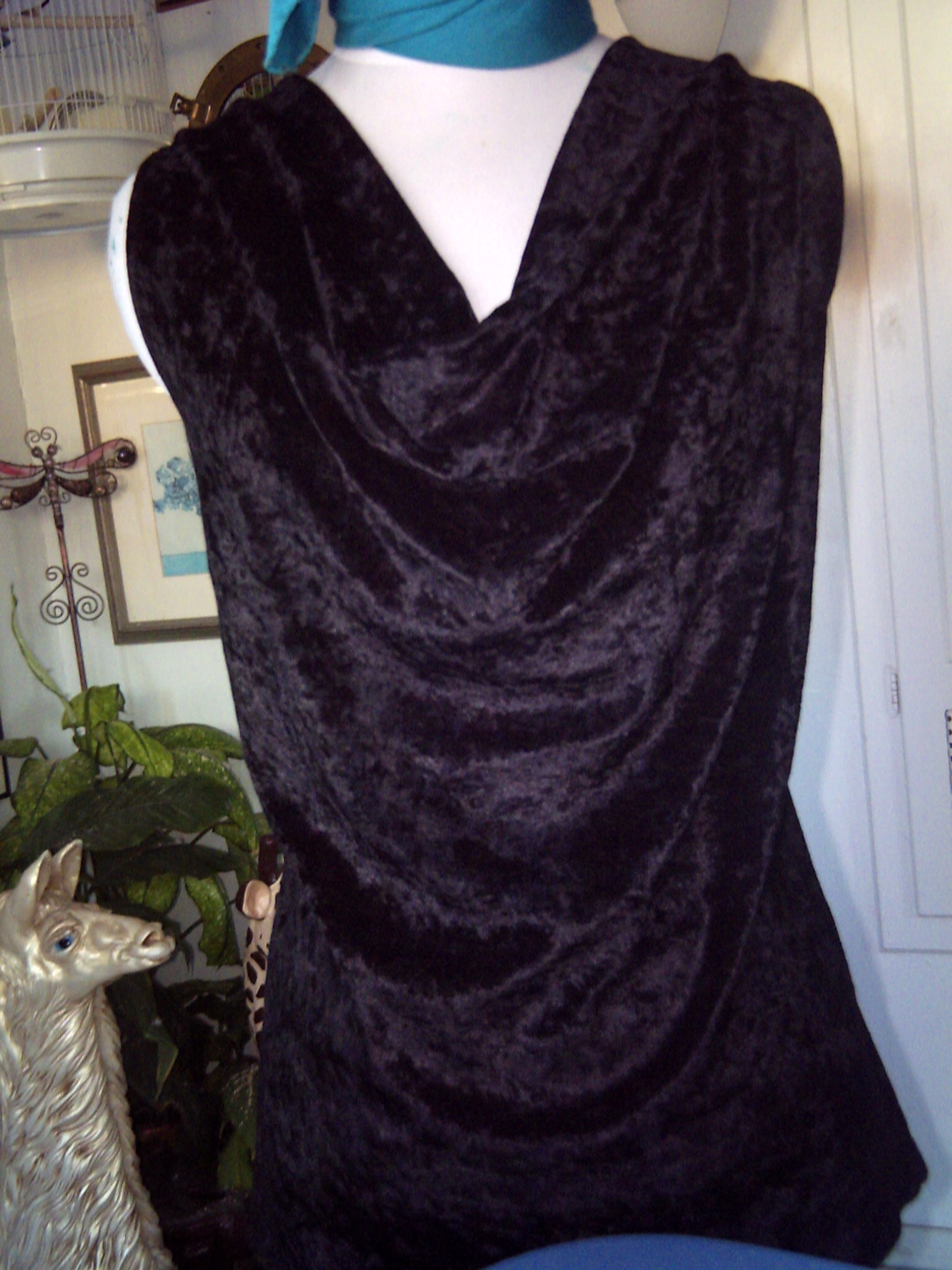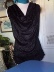 Well, generally I don’t like to work with knit fabric. I usually run when someone asks me to make something with it. Guess what? Yep, that’s right. I finally broke down, and made a blouse using black, crushed penne. Kind of a stretch, crushed velvet. I was also wanting to make a “cowel” neckline. Haven’t done that before. So there you have it. Success with knit, and a new, fun neckline. I am pleased.