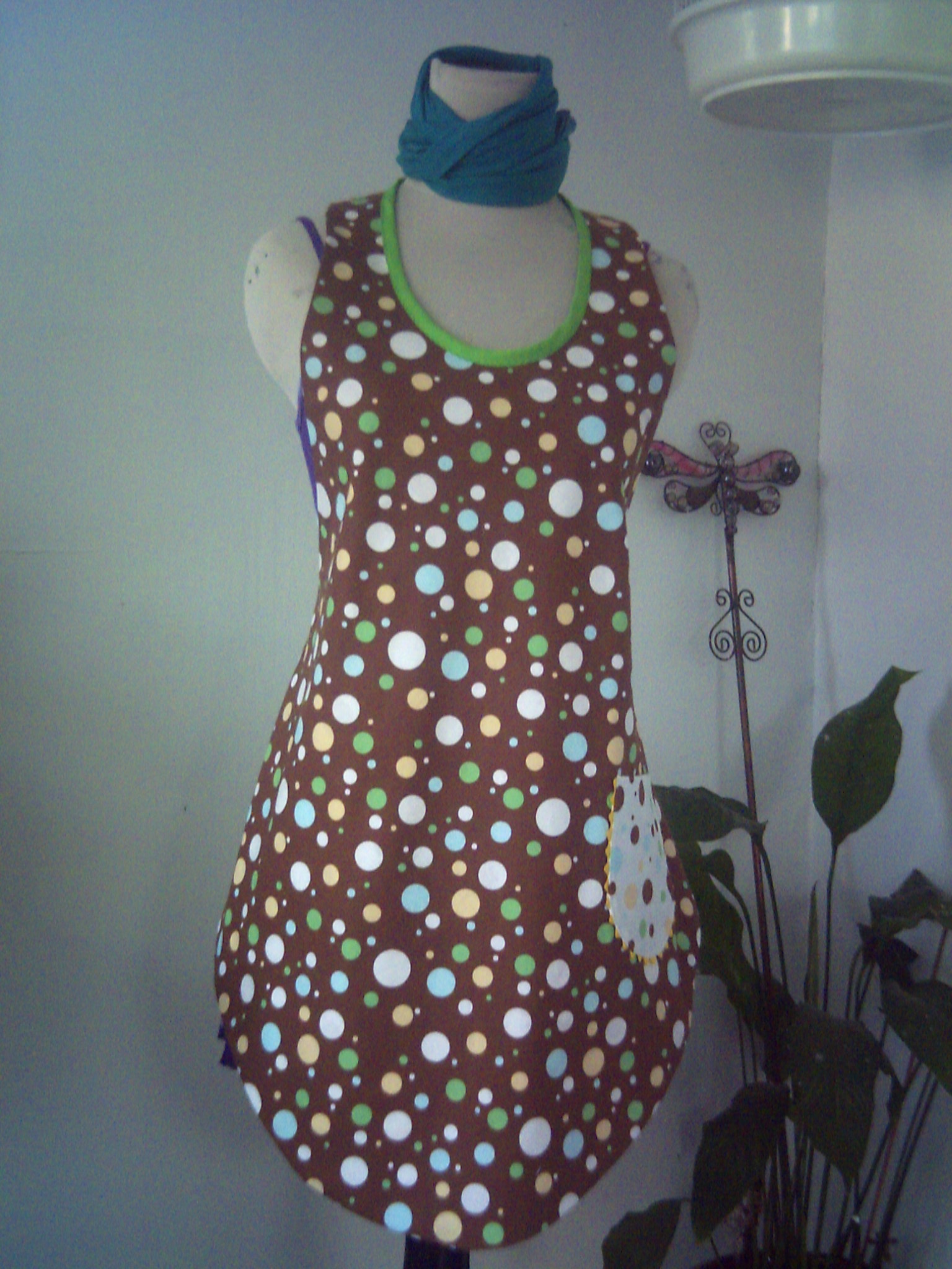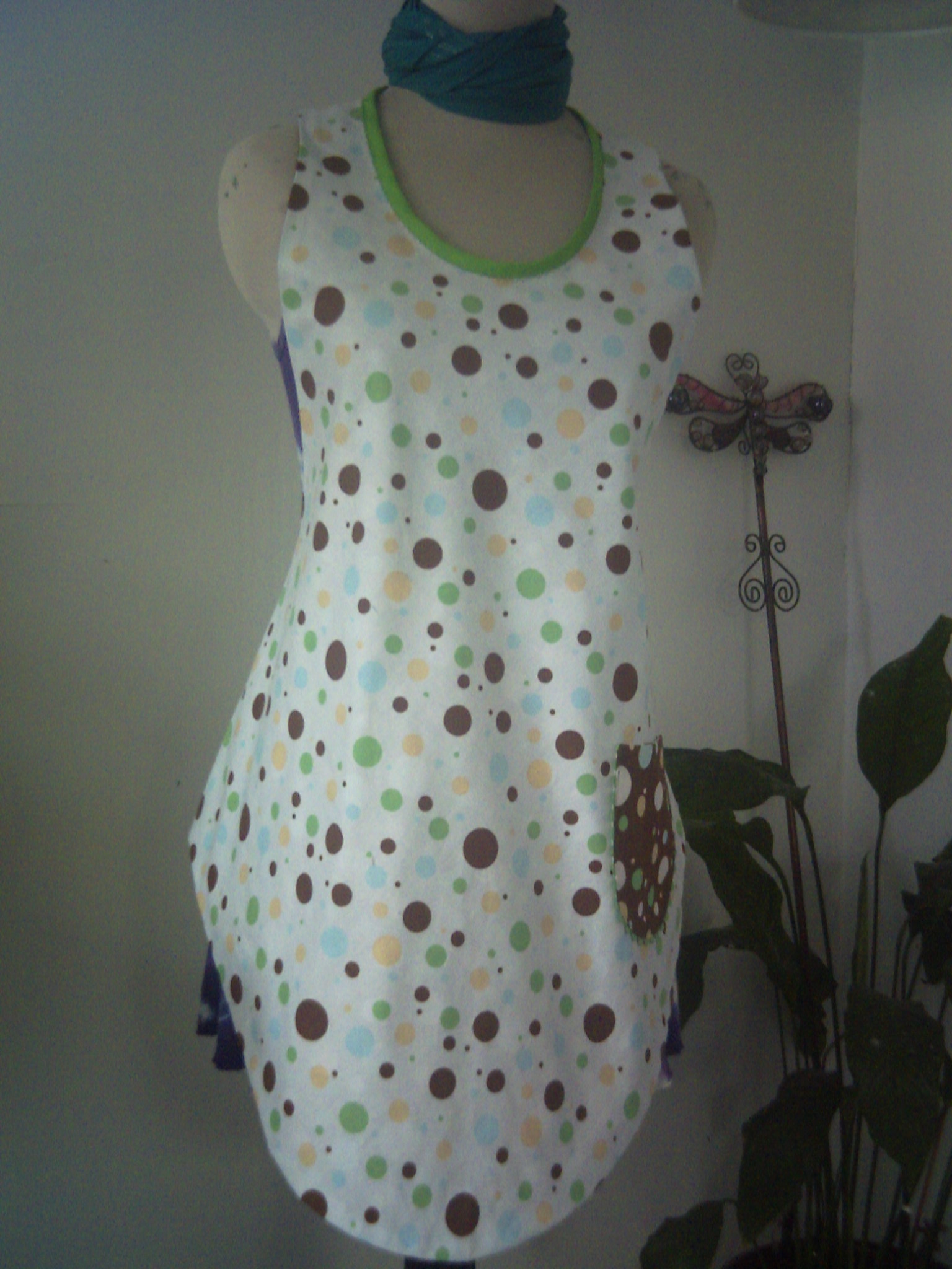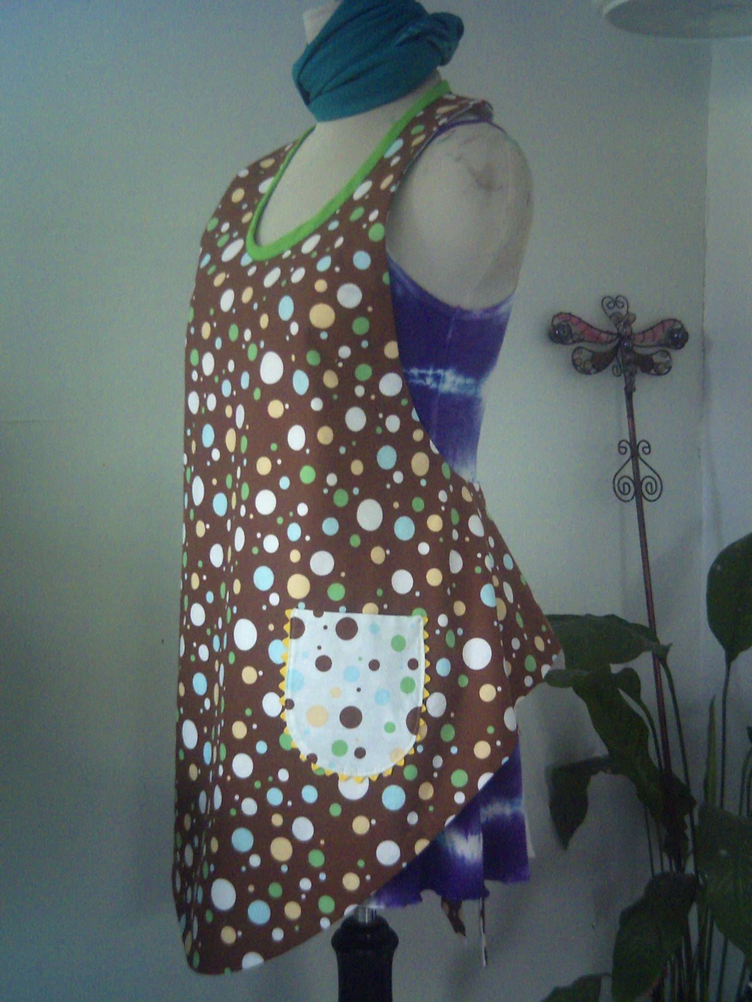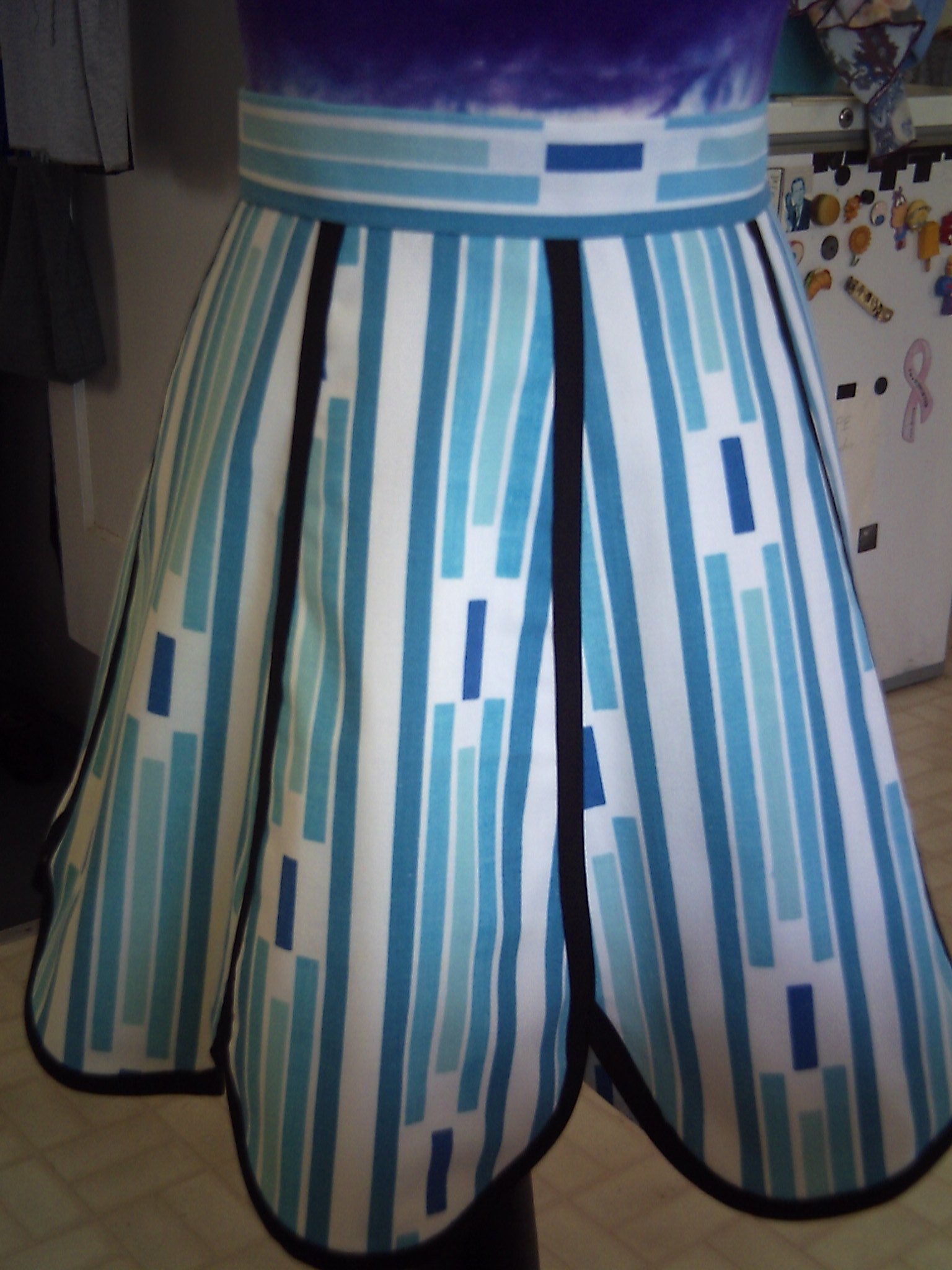 Apron patterns seem to be finding me lately. I don’t usually wear them except at my job, and washing dishes at family dinners. But, I am drawn in by the cuteness of them. I recently made two, and I am pleased with the results. One has a “50’s” flair, and the other is a “flapper”. Both take very little fabric, and are reasonably easy to make. The curves are a little tricky, but overall, not bad. The “flapper” I made double faced/ reversible. Twice as much cuteness in one apron!