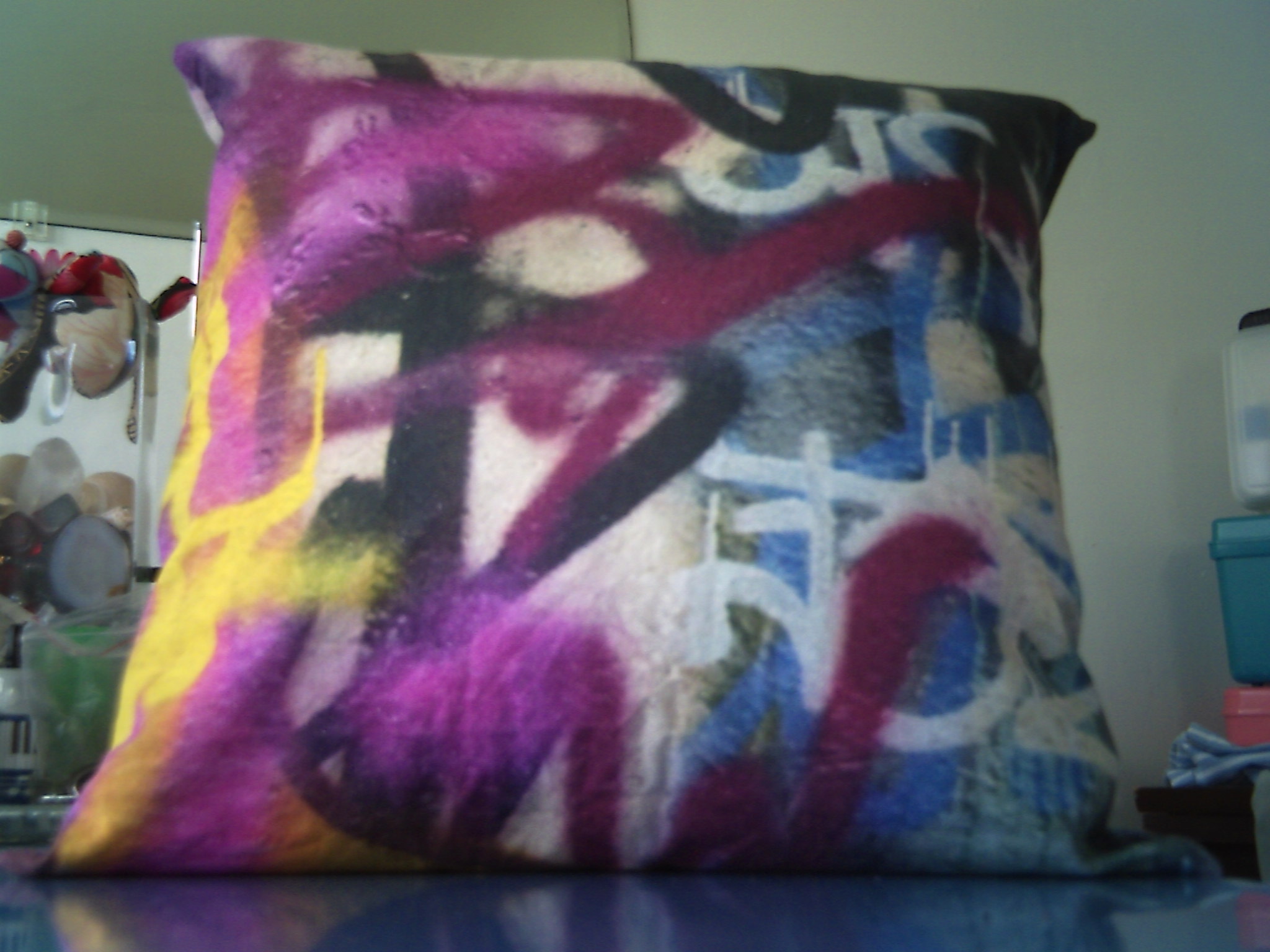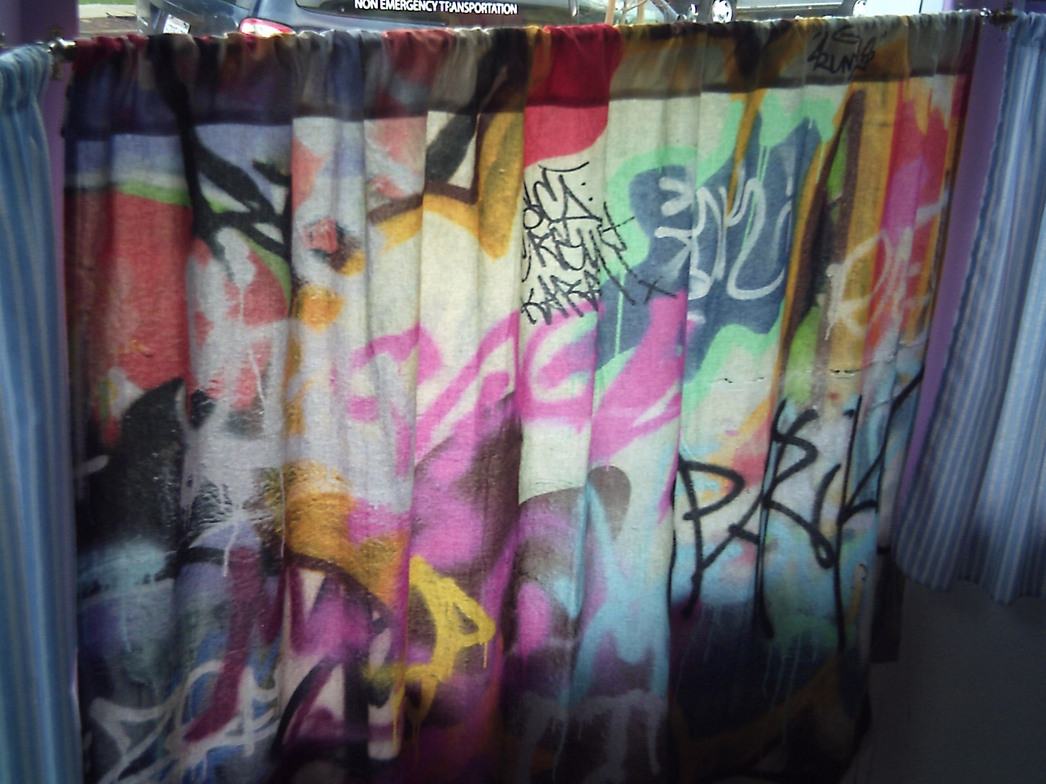 Angel recently purchased two panels of grafitti print cotton to be used for wall cover/ what ever you want..??? Possibilities are endless. She wanted two curtains, two pillow covers and a set of pillow cases made from the fabric. I was pleased to do it for her. They turned out great!